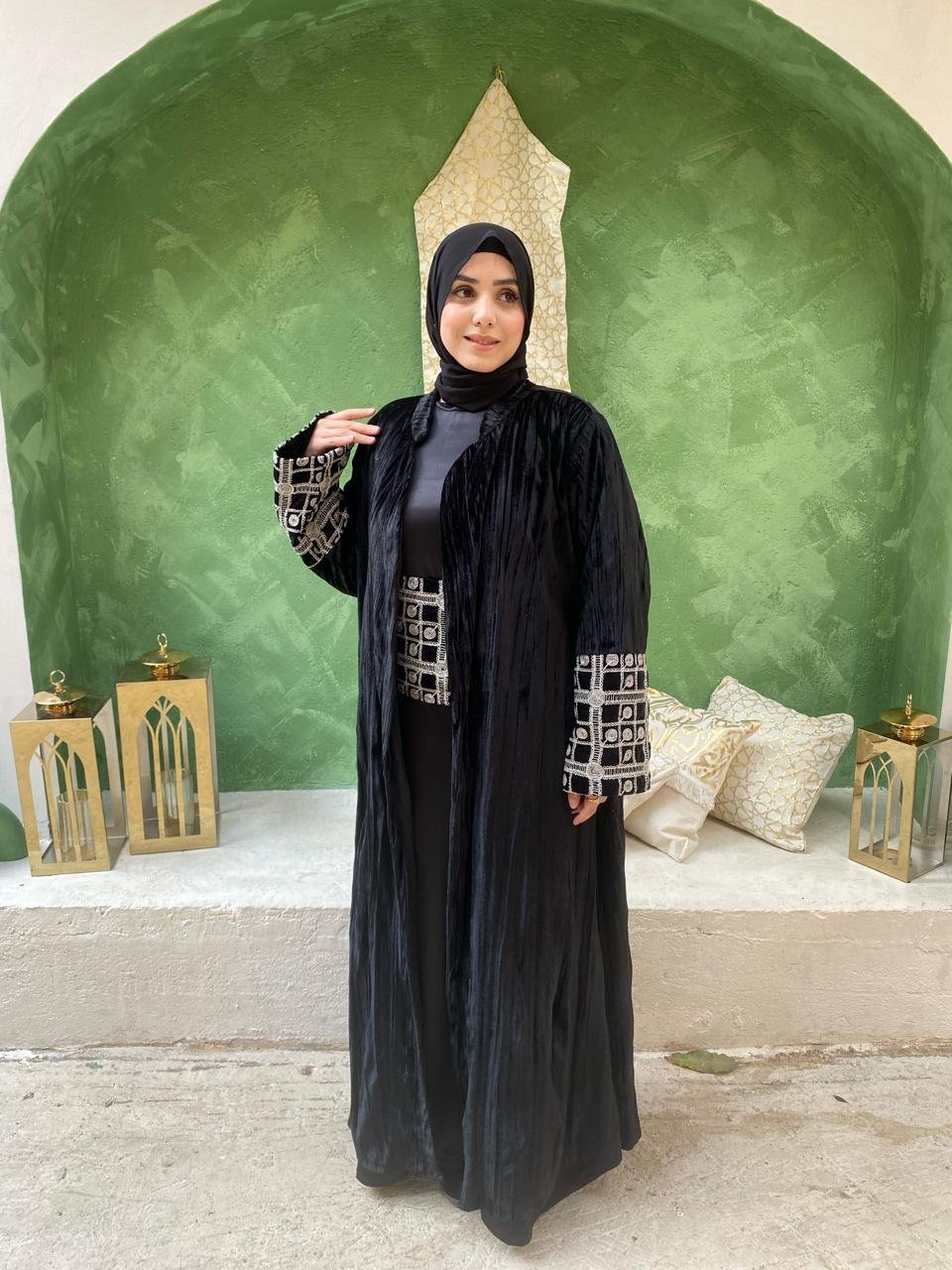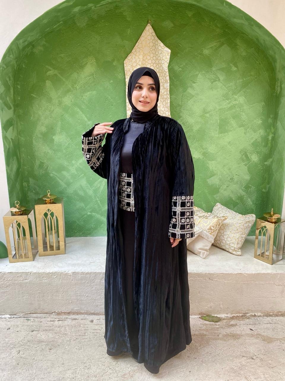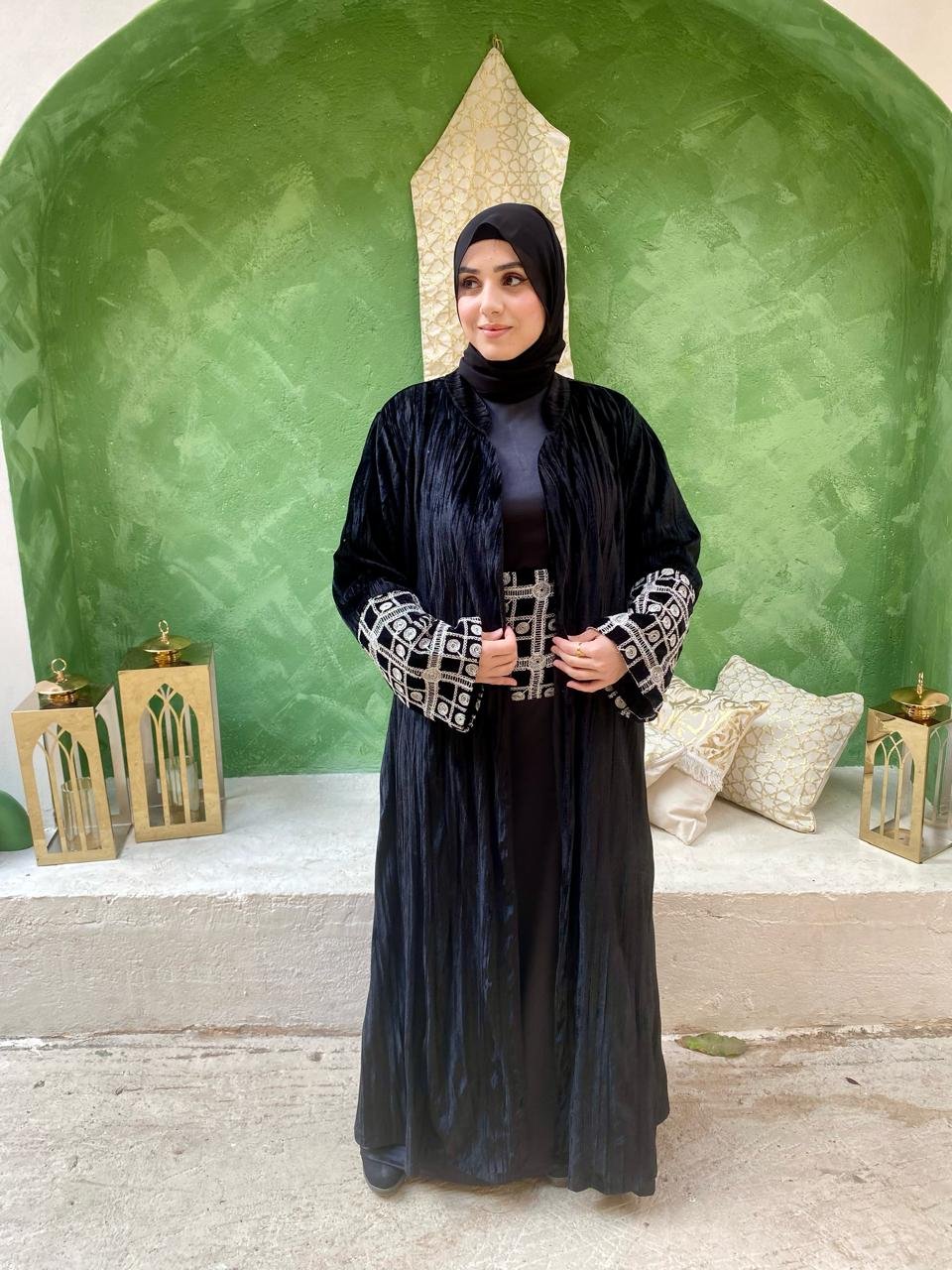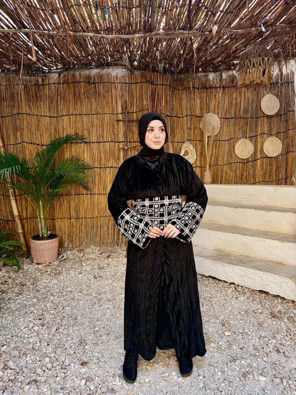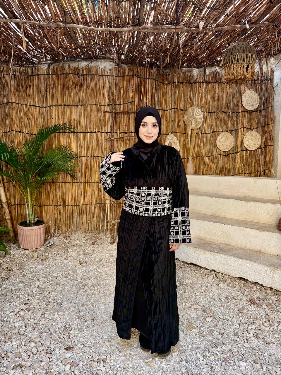 Our black kaftan features a flattering belt and delicate beaded sleeves for an effortlessly elegant look.