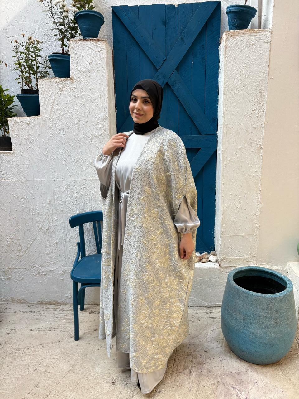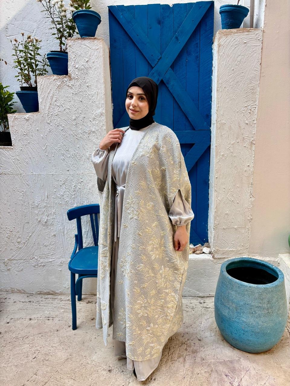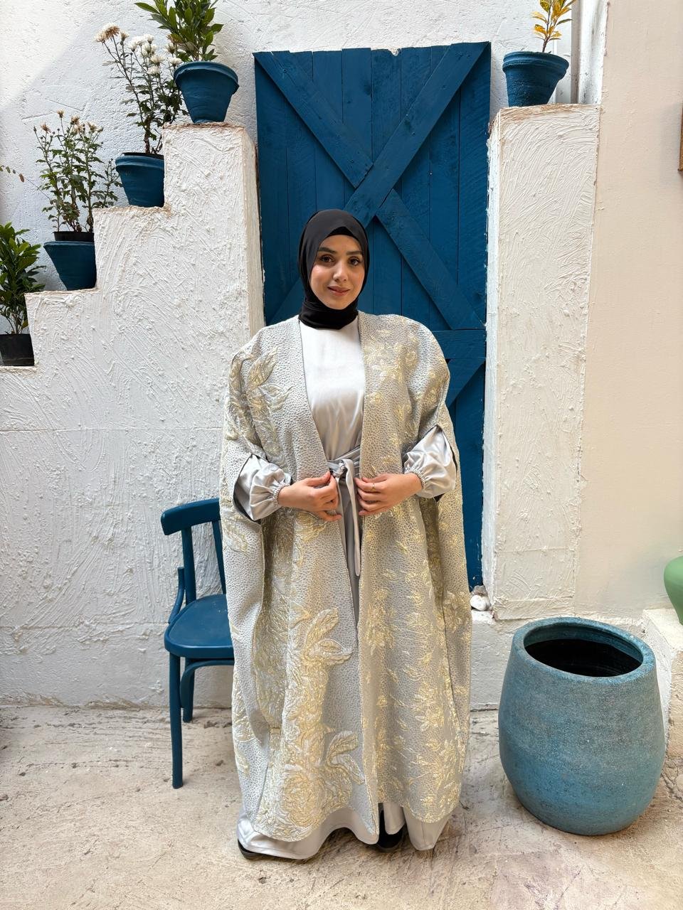 A silver kaftan designed to shine with effortless elegance — perfect for special Ramadan nights.
