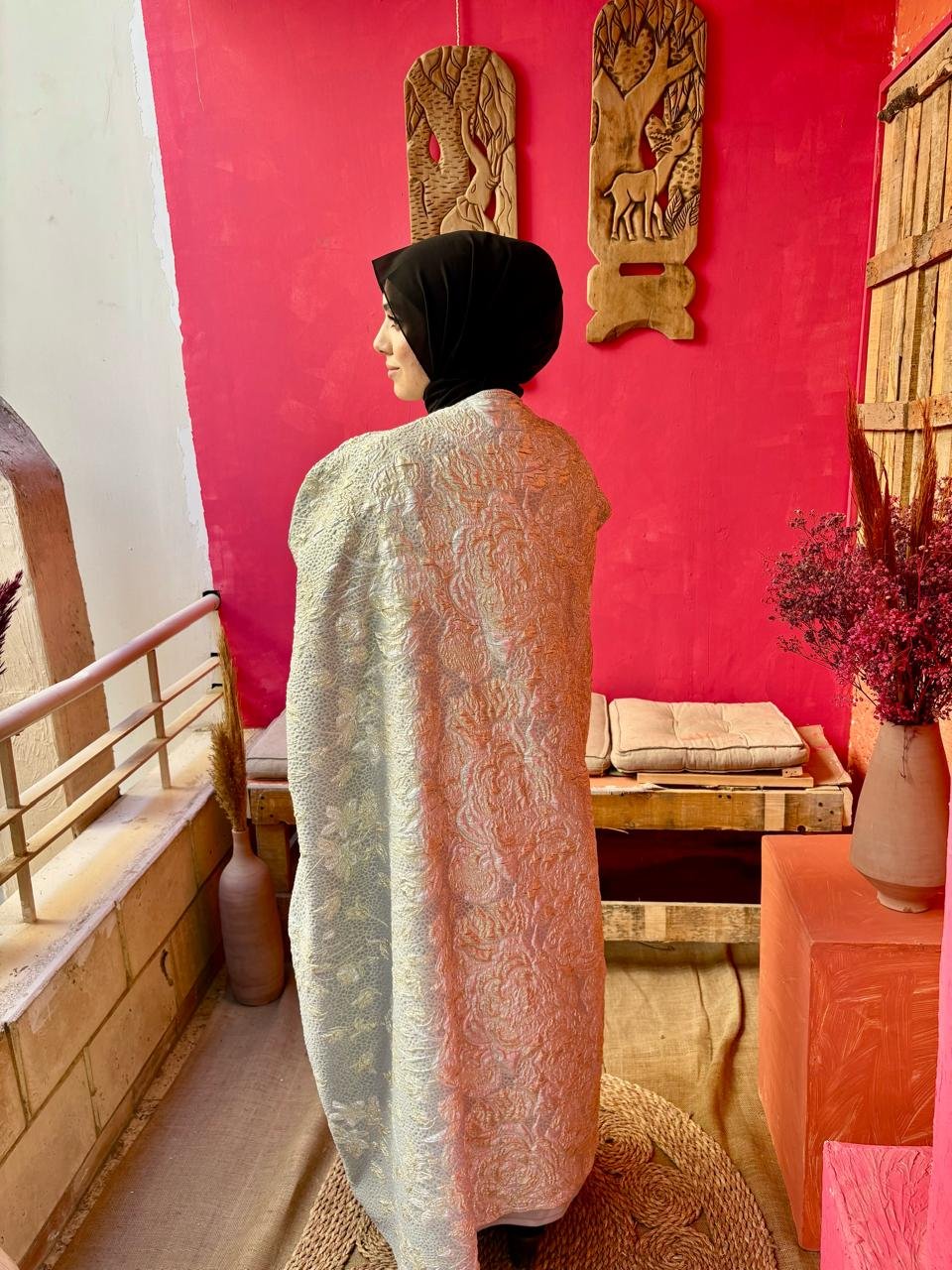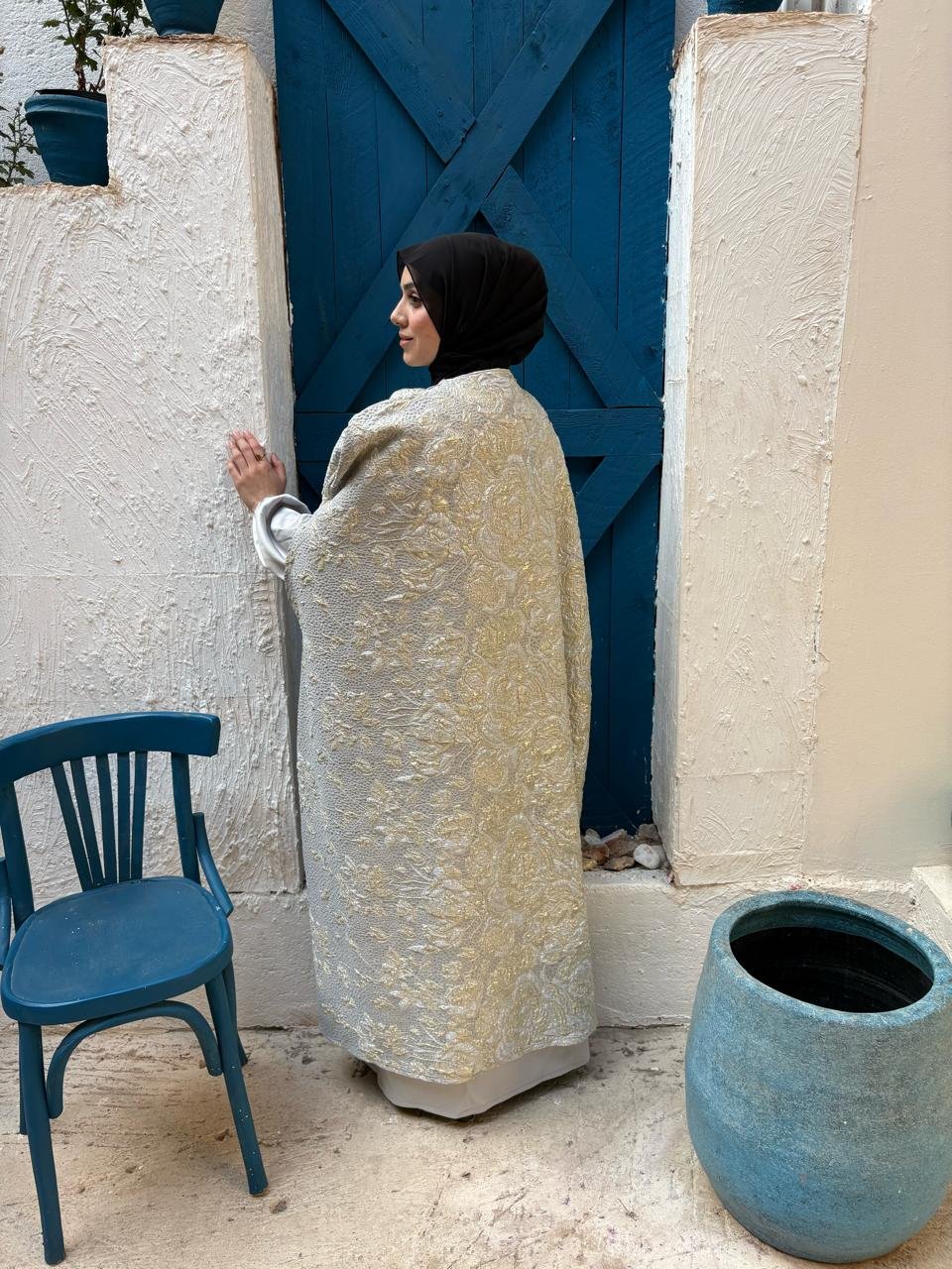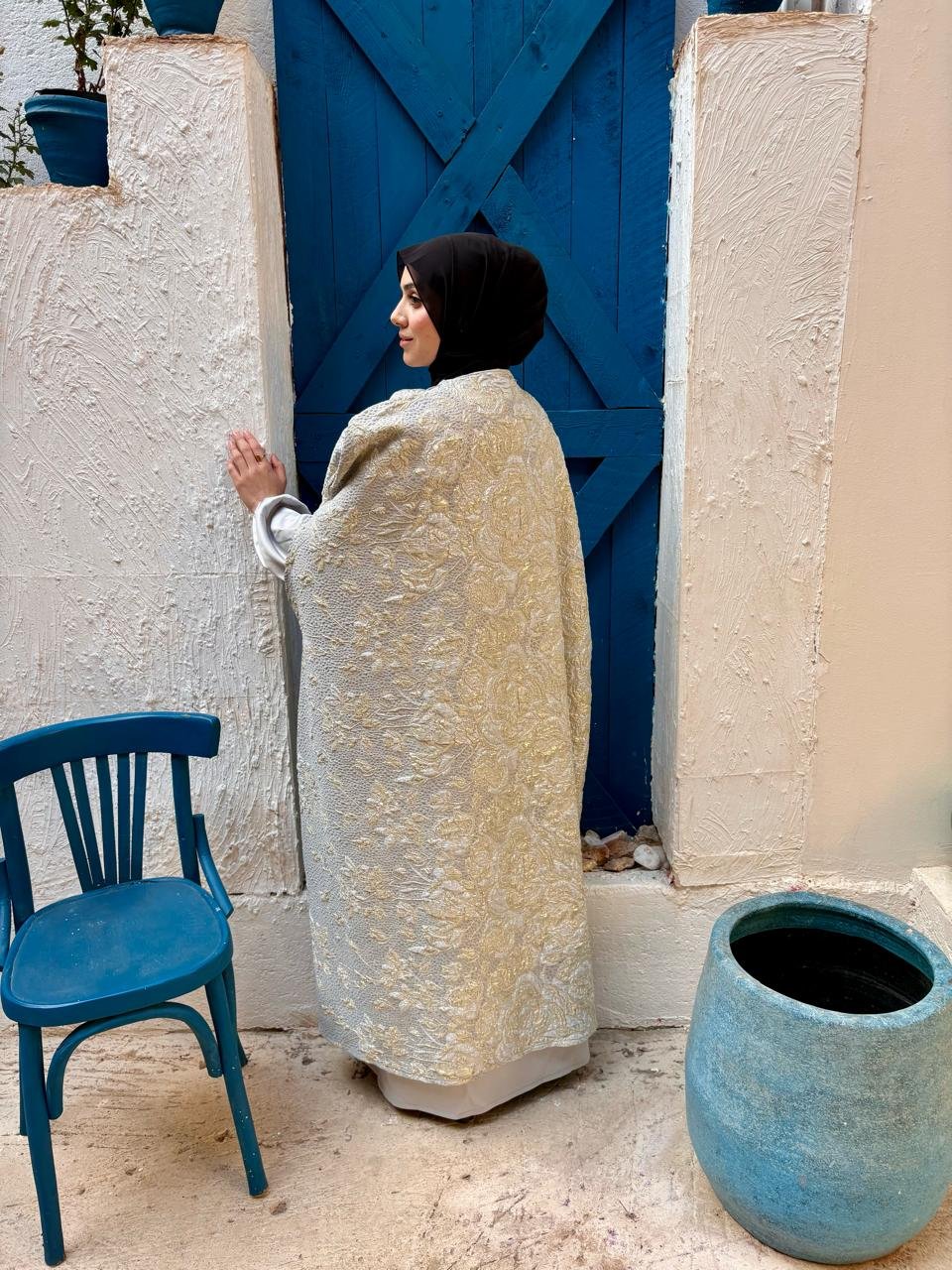 A silver kaftan designed to shine with effortless elegance — perfect for special Ramadan nights.